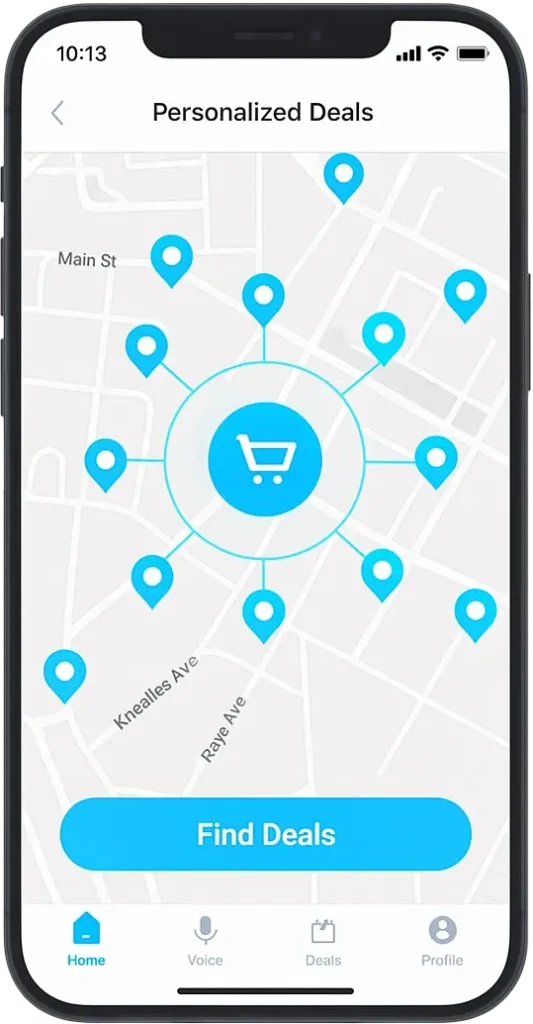 ProxiShop’s Al instanty sifts through local offers and your preferences to find the best deals tailored to your current location.